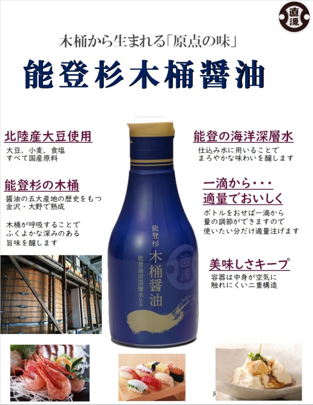 北陸産大豆をはじめ、小麦、食塩など全て国産原料を使用しています。特注の能登杉の木桶で仕込み、醤油の五大産地のひとつである金沢・大野の醤油醸造に適した地でじっくりと熟成しています。仕込み水に能登の海洋深層水を用いることでまろやかな味わいを、さらに木桶が呼吸することでふくよかな深みのある旨みを醸します。みりんや砂糖などの甘味は一切加えておらず、醤油本来の味をお楽しみいただけます。 容器は、二重構造で中身が空気に触れにくく、ボトルをおすと一滴ずつ使用する量を調整できるデラミボトルを使用しています。